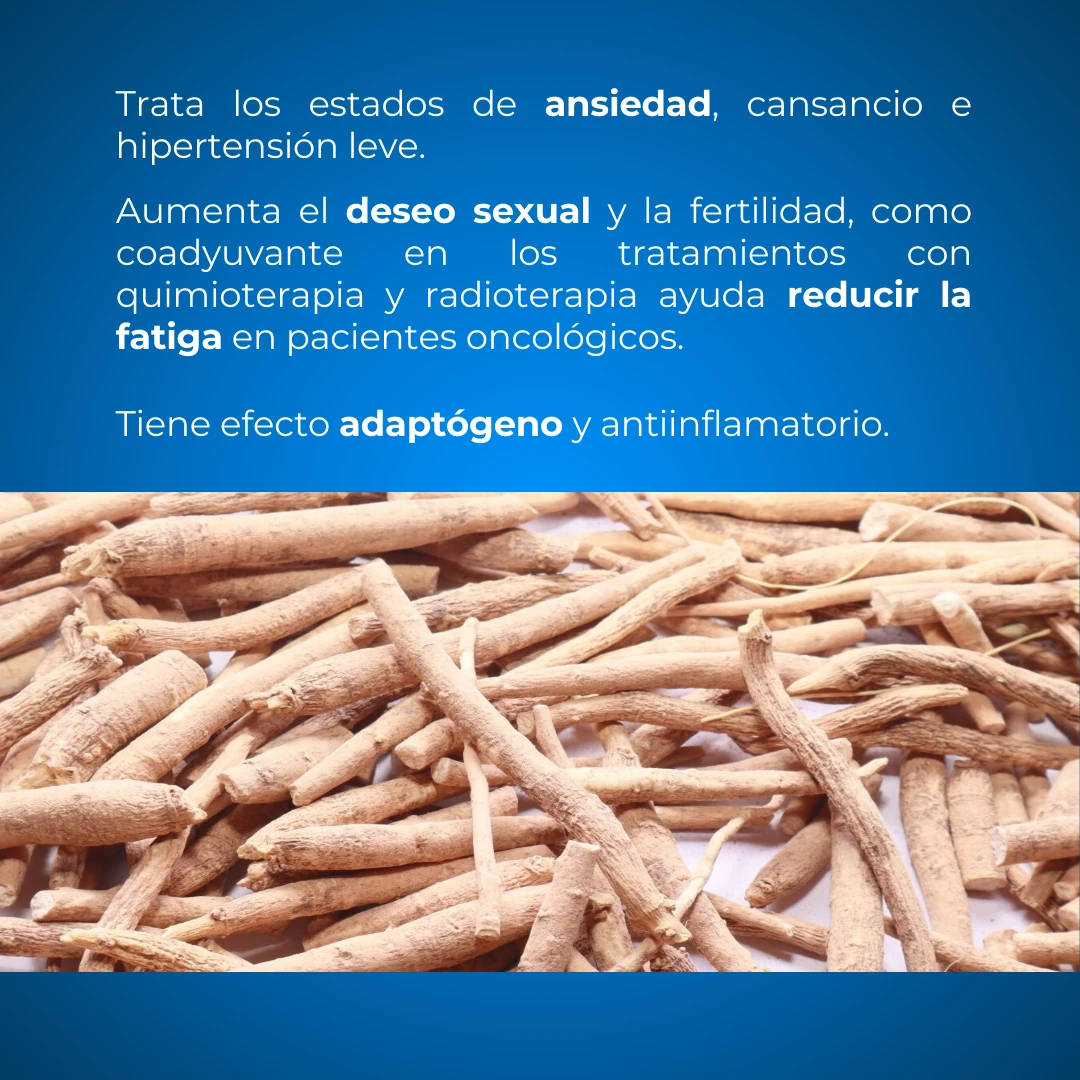 Usos tradicionales: Raíz: se ha empleado para tratar los estados de ansiedad, hiperexcitabilidad nerviosa, astenia, hipertensión leve y diabetes tipo 2, en pacientes con Parkinson y Alzheimer, para aumentar el deseo sexual y la fertilidad, como coadyuvante en los tratamientos con quimioterapia y radioterapia por sus propiedades antioxidantes y detoxificantes, y para reducir la fatiga en pacientes oncológicos.