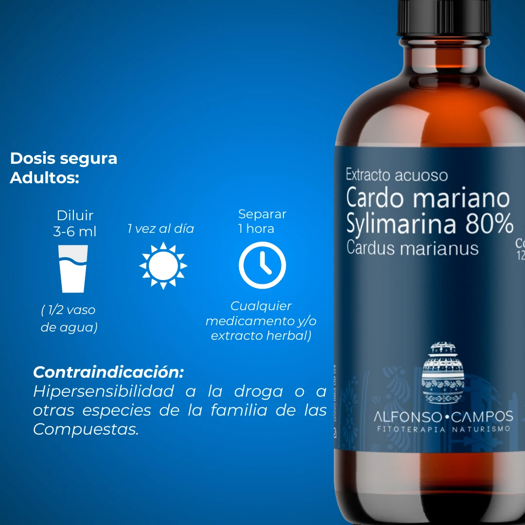 Usos establecidos por documentos científicos: La silimarina ha demostrado experimentalmente efectos antioxidantes, hipolipemiante, antihipertensivo, antidiabético, antiaterosclerótico, antiobesidad y hepatoprotector. Actúa como antídoto frente a diferentes venenos biológicos (micotoxinas, venenos de serpientes y toxinas bacterianas) y químicos (metales, fluoruro, pesticidas, agentes cardiotóxicos, neurotóxicos, hepatotóxicos y nefrotóxicos)
