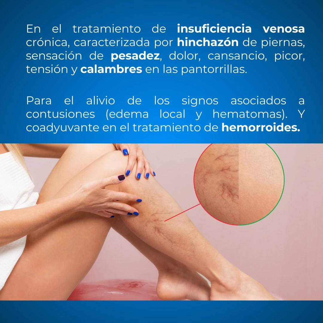– El uso tradicional, en aplicación tópica, para el tratamiento de los síntomas de malestar y pesadez de las piernas relacionados con trastornos venosos leves y para el alivio de los signos asociados a contusiones (edema local y hematomas).