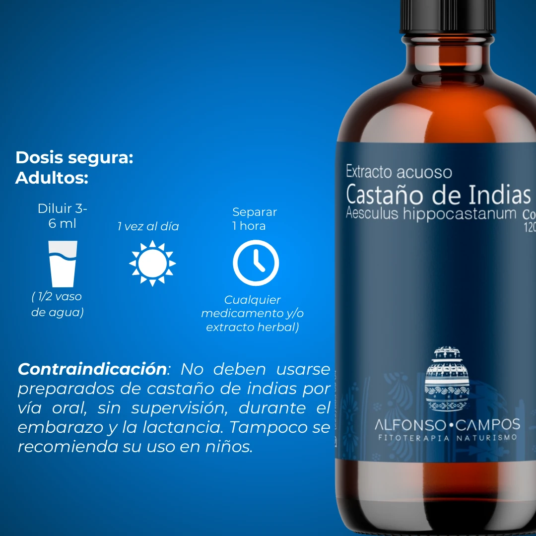 Contraindicación: Aunque existen estudios clínicos con mujeres embarazadas y se ha observado ausencia de efectos adversos, de acuerdo con la práctica médica habitual no deben usarse preparados de castaño de indias por vía oral, sin supervisión, durante el embarazo y la lactancia. Tampoco se recomienda su uso en niños.