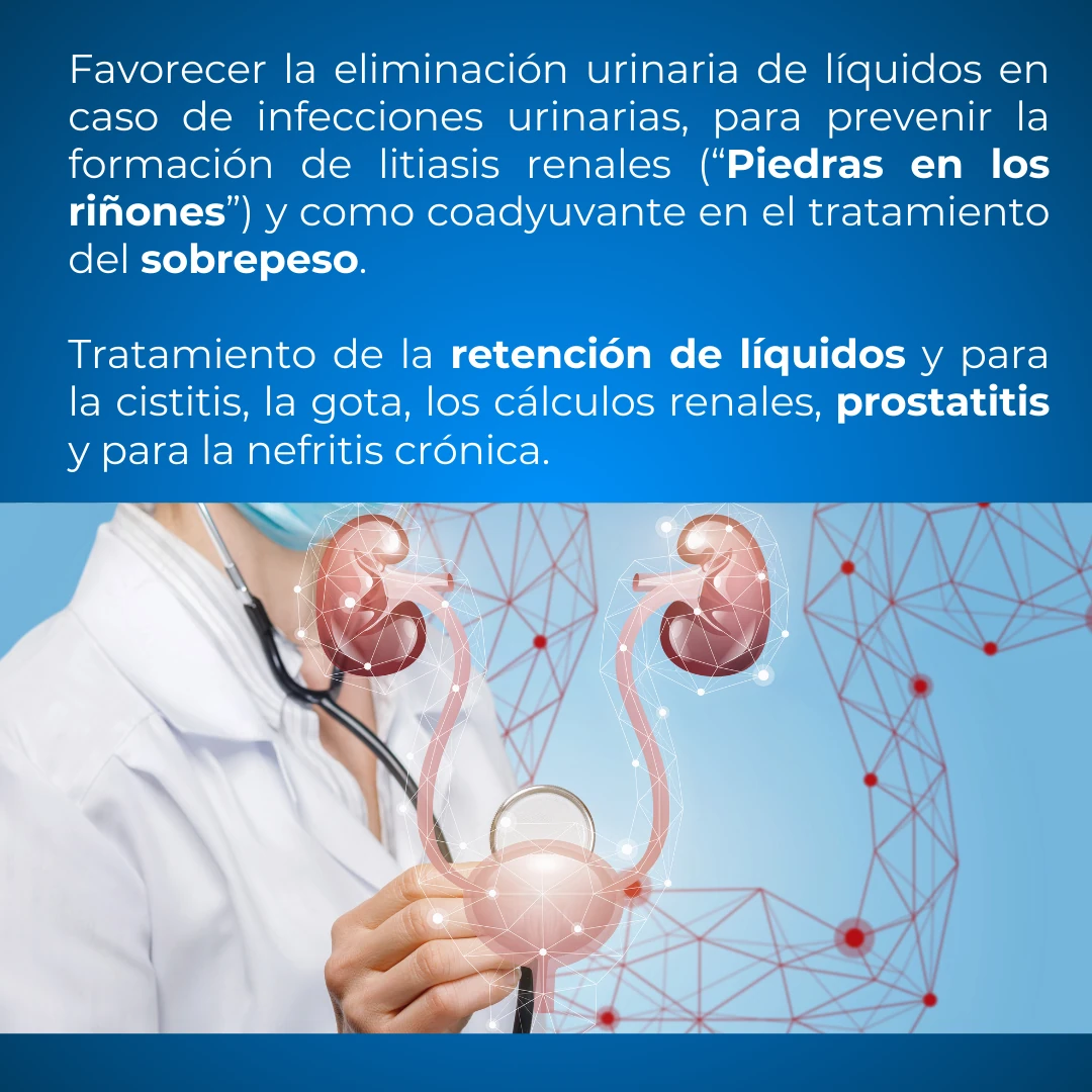 - Favorecer la eliminación urinaria de líquidos en caso de infecciones urinarias, para prevenir la formación de litiasis renales (“Piedras en los riñones”) y como coadyuvante en el tratamiento del sobrepeso.