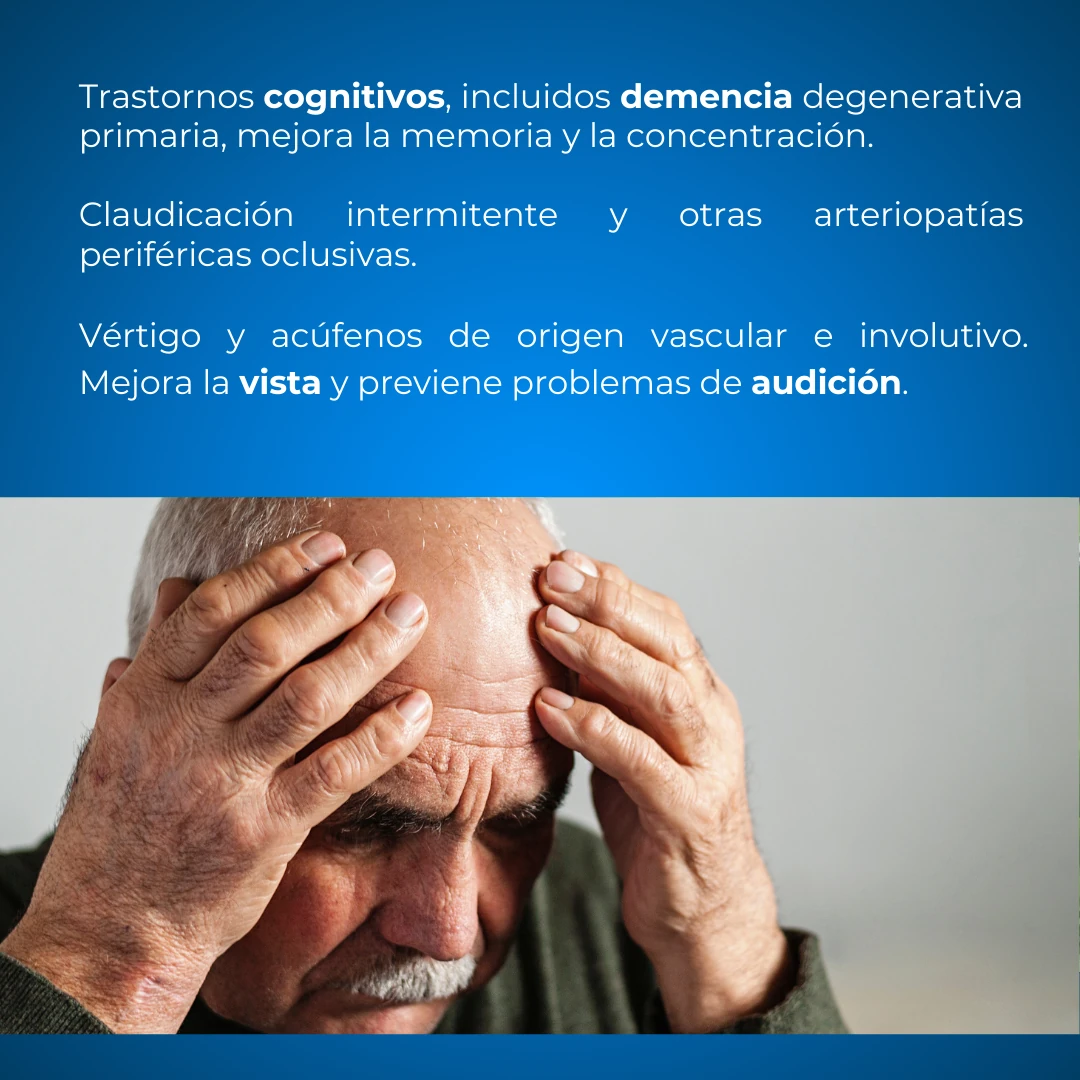 - Trastornos cognitivos, incluidos demencia degenerativa primaria, demencia vascular y formas intermedias de ambas, que cursan con déficit de memoria, trastornos en la concentración y humor depresivo.