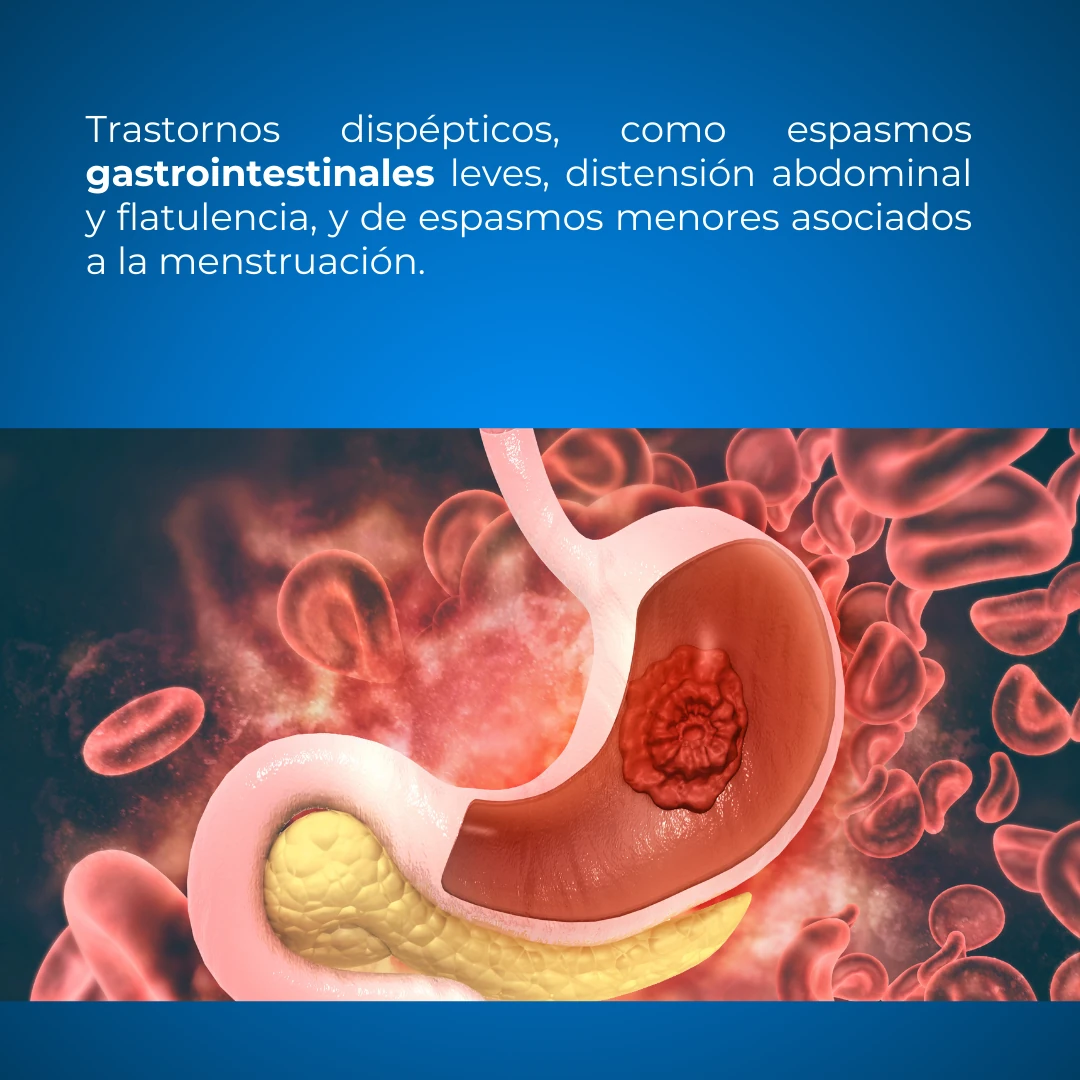 - Tratamiento sintomático de trastornos dispépticos, como espasmos gastrointestinales leves, distensión abdominal y flatulencia, y de espasmos menores asociados a la menstruación.